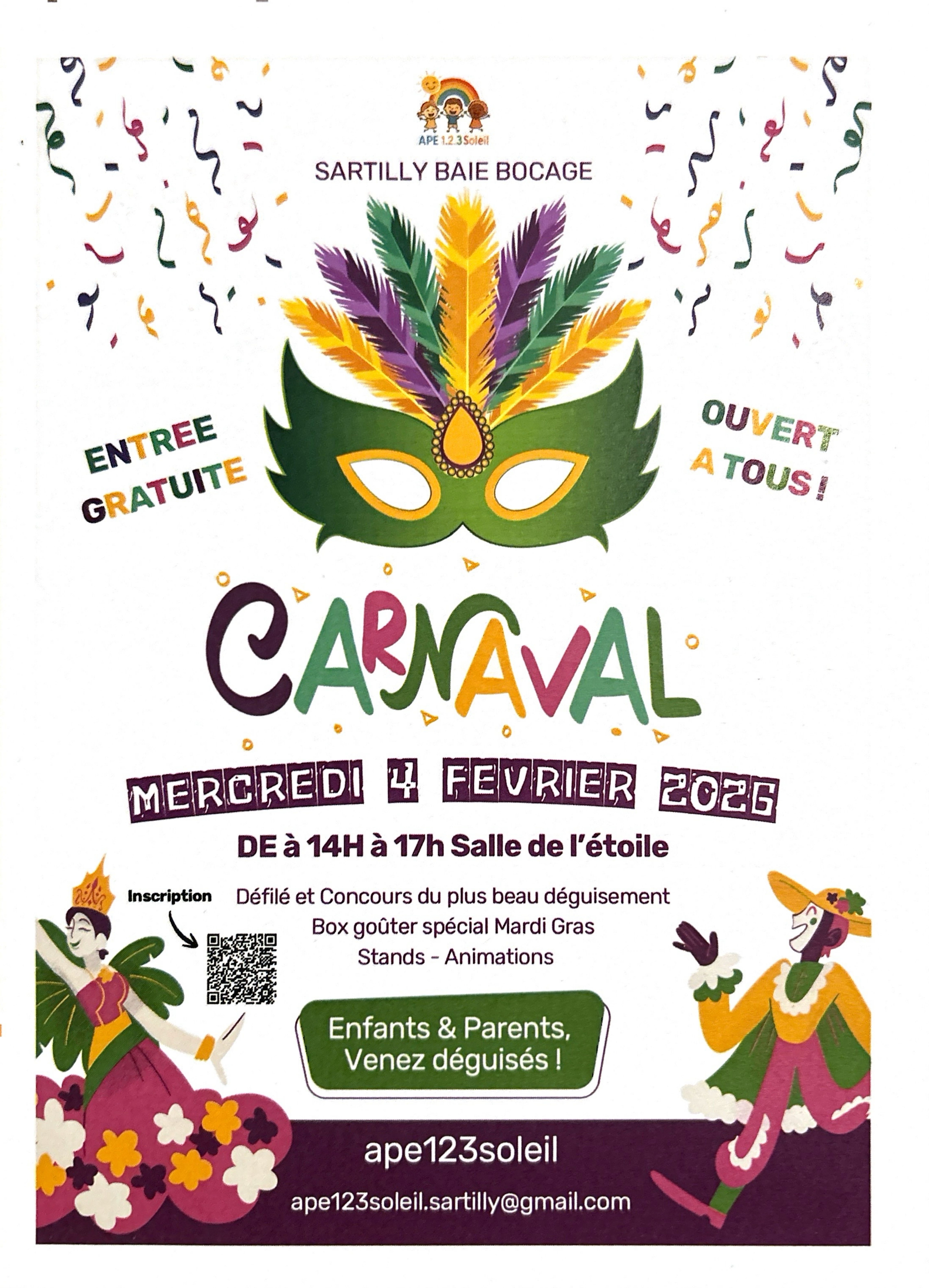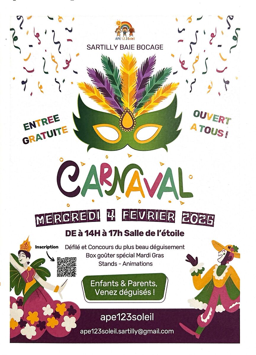 L'APE 1.2.3 Soleil organise le Carnaval des enfants qui se déroulera le mercredi 4 février, de 14h à 17h, à la salle de l’Étoile.